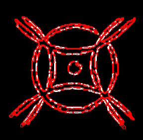 In the sight of fire, this paste was mixed by hand (it was considered a bad taboo to use implements to mix as this suggested fear) and smeared in circles quartered by 4 lines on the ground and walls of the building in which the protected activity took place. In this instance the ghost marks were pasted onto the floor, one mark for each set of tanks that would sit above.